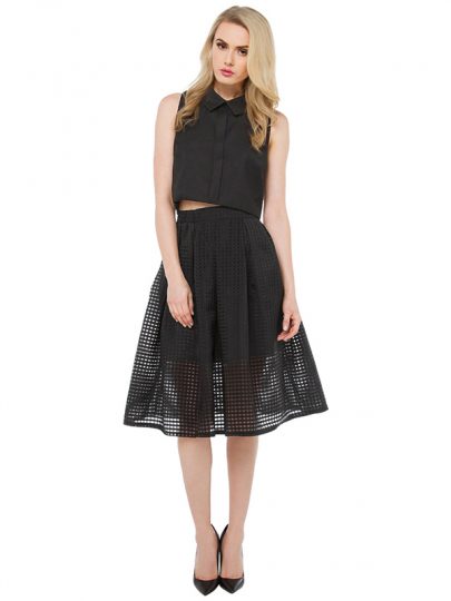 Black Grid Lace Front Skater Skirt